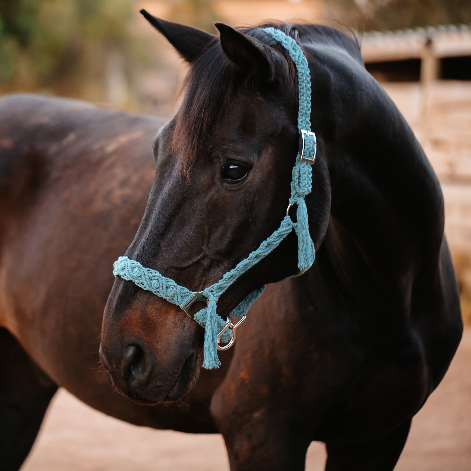 Our Mandala model in bluegreen with fringes on a black horse sideways
