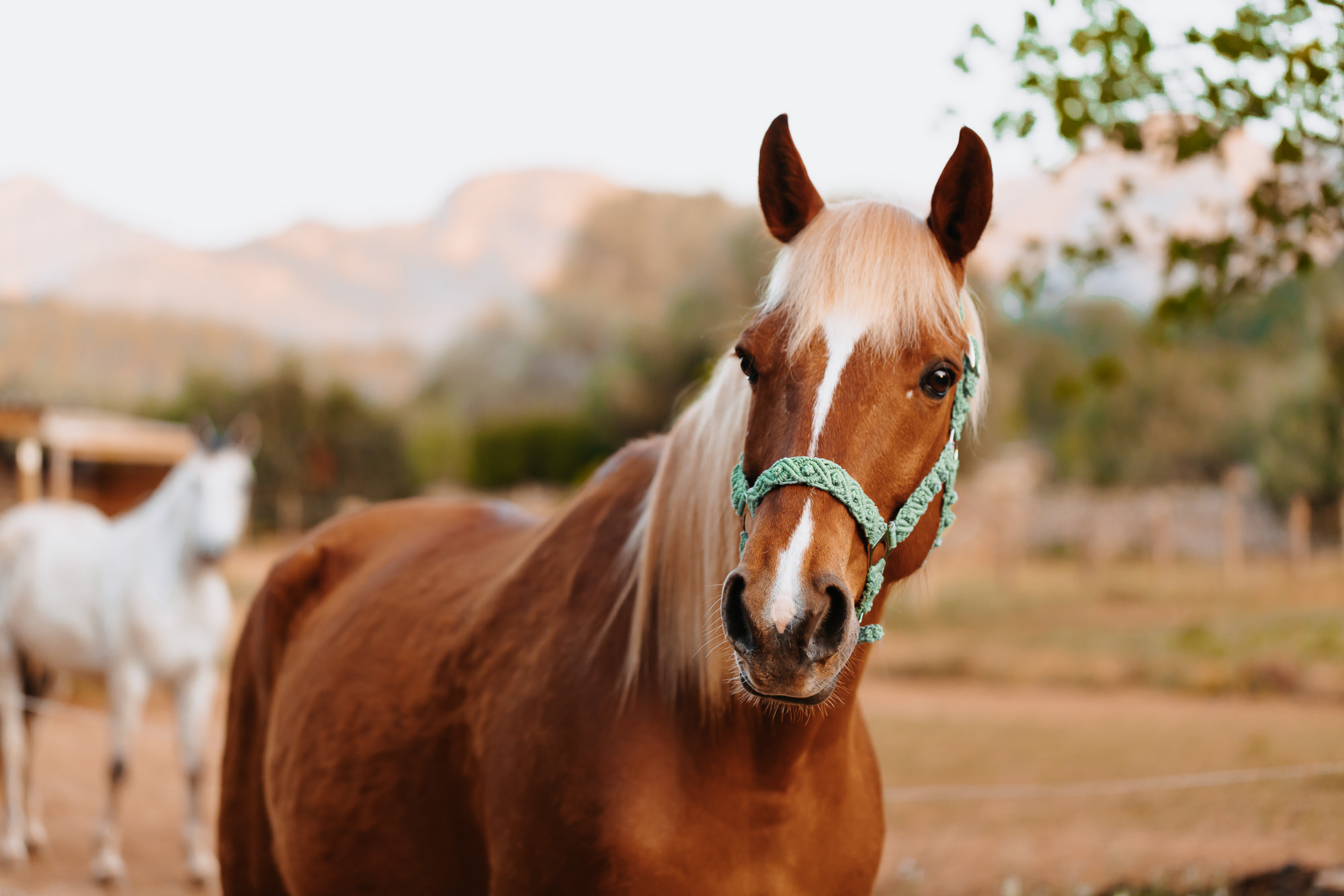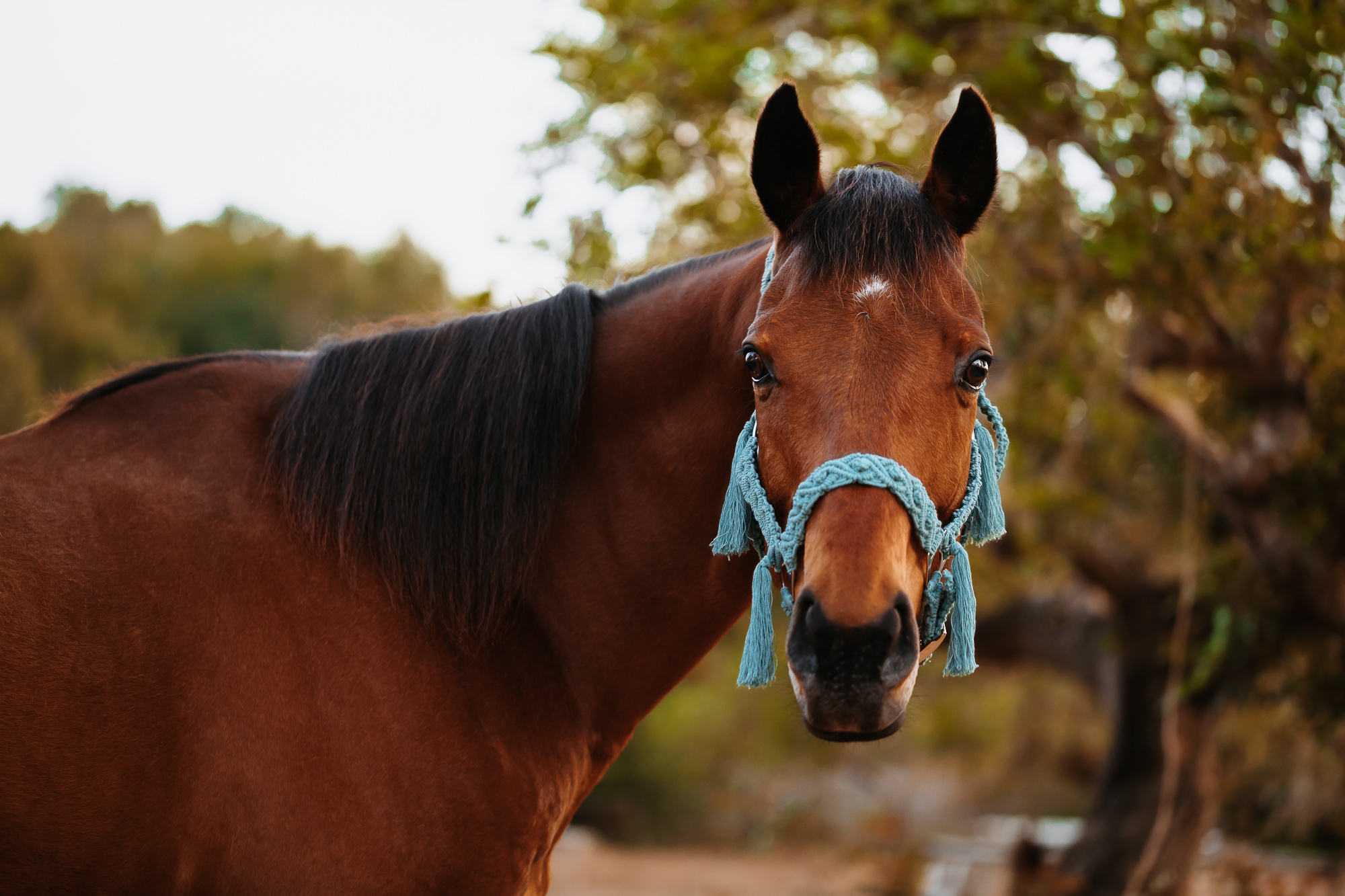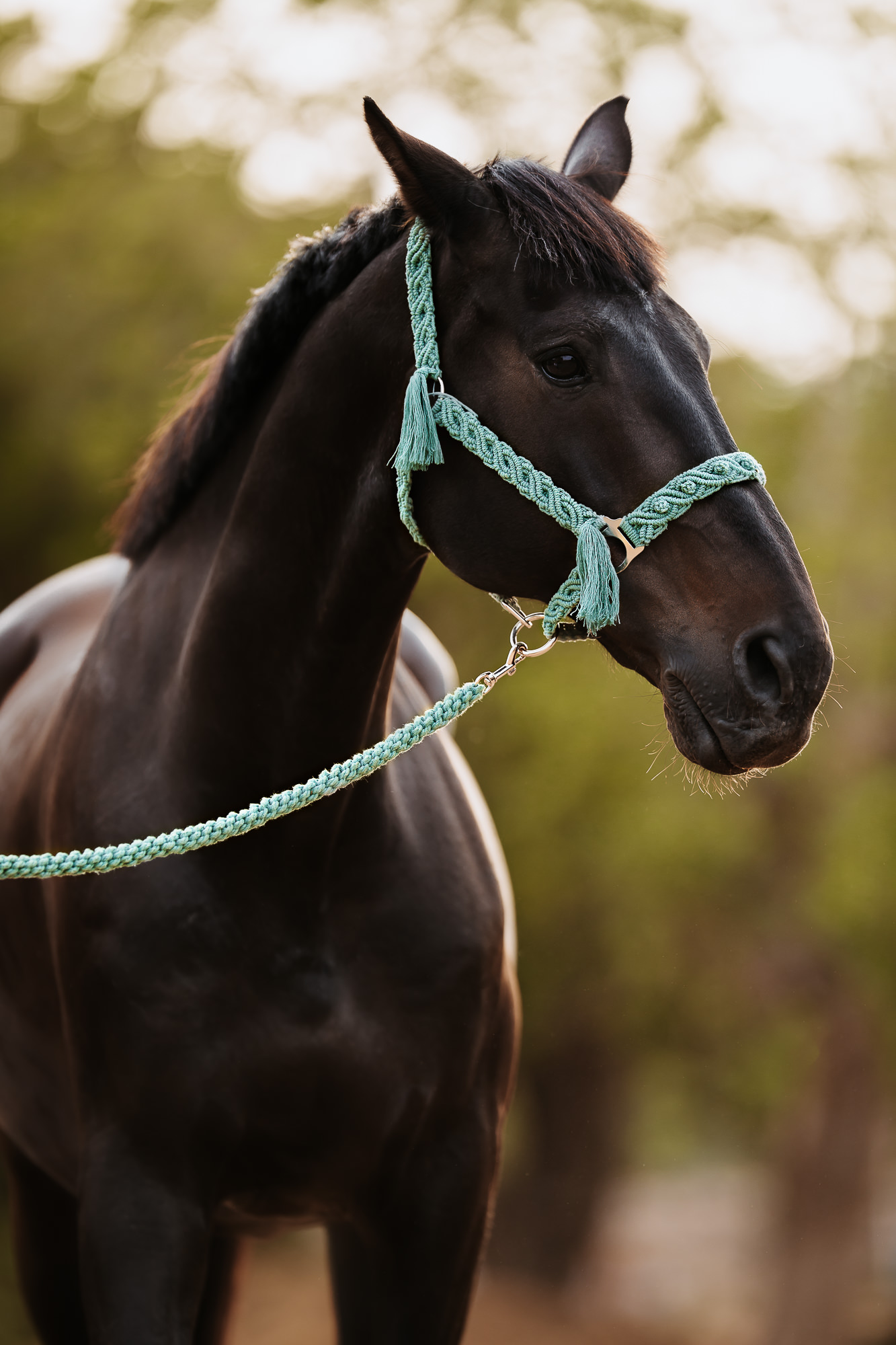 Our model Alma in bluegreen with Fringes on a brown horse in front